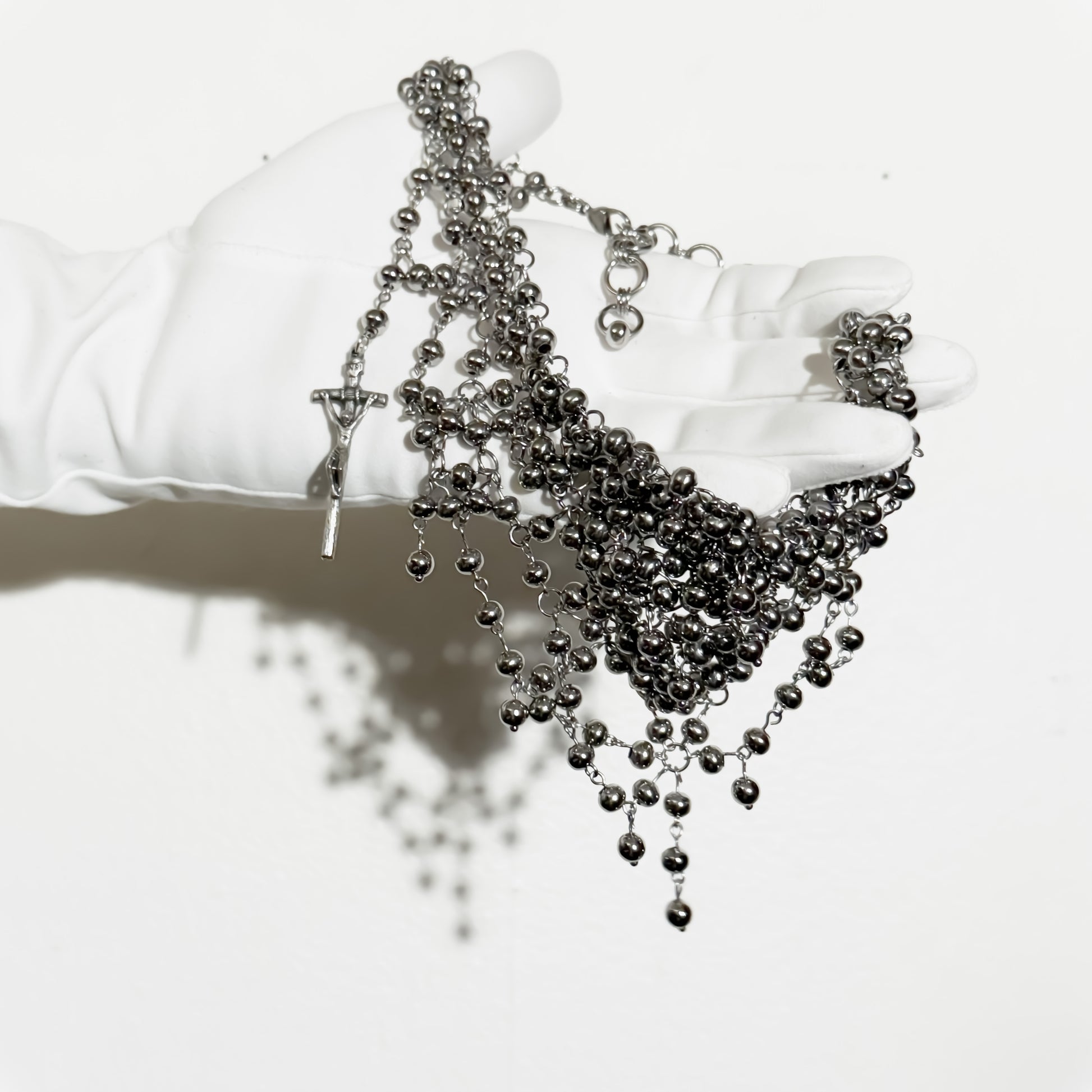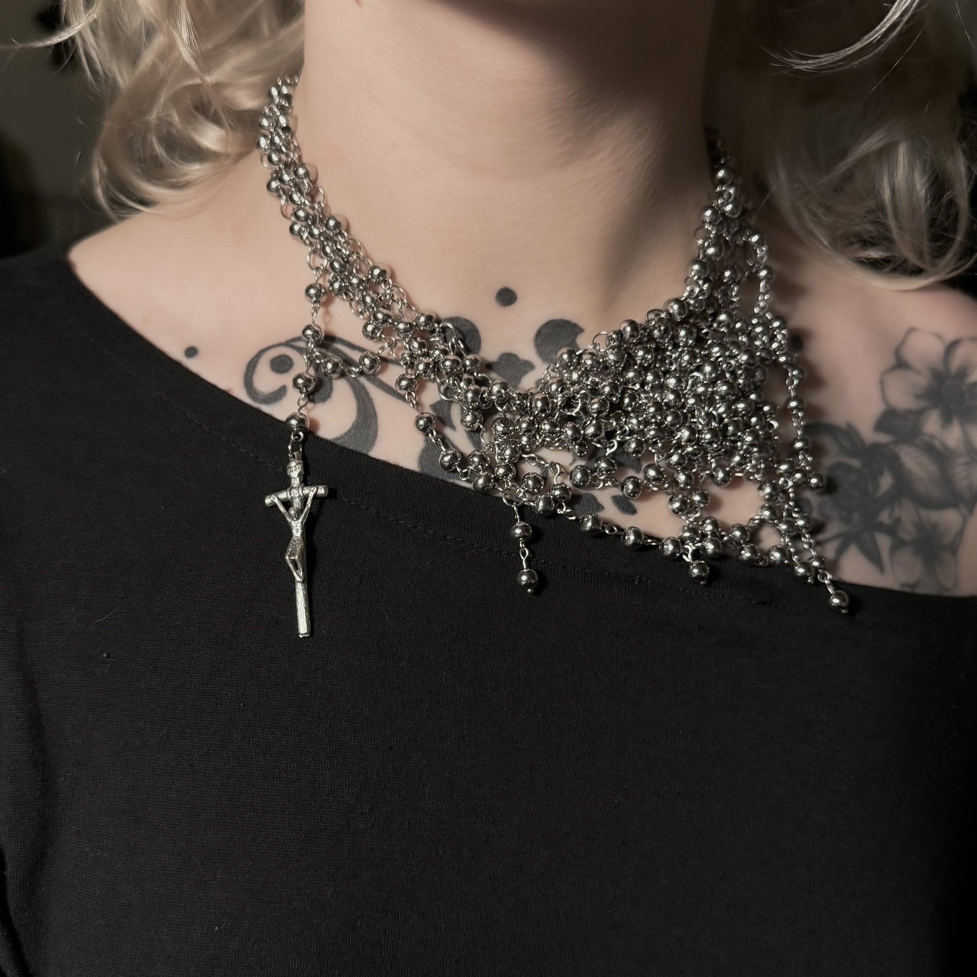 One of a kind stainless steel necklace. Inspired by connective tissue and organic decay, and the second piece in the Viscera line. Created with meticulously interwoven stainless beads and a vintage crucifix pendant to to make an abstract, free flowing form of asymmetrical clusters.